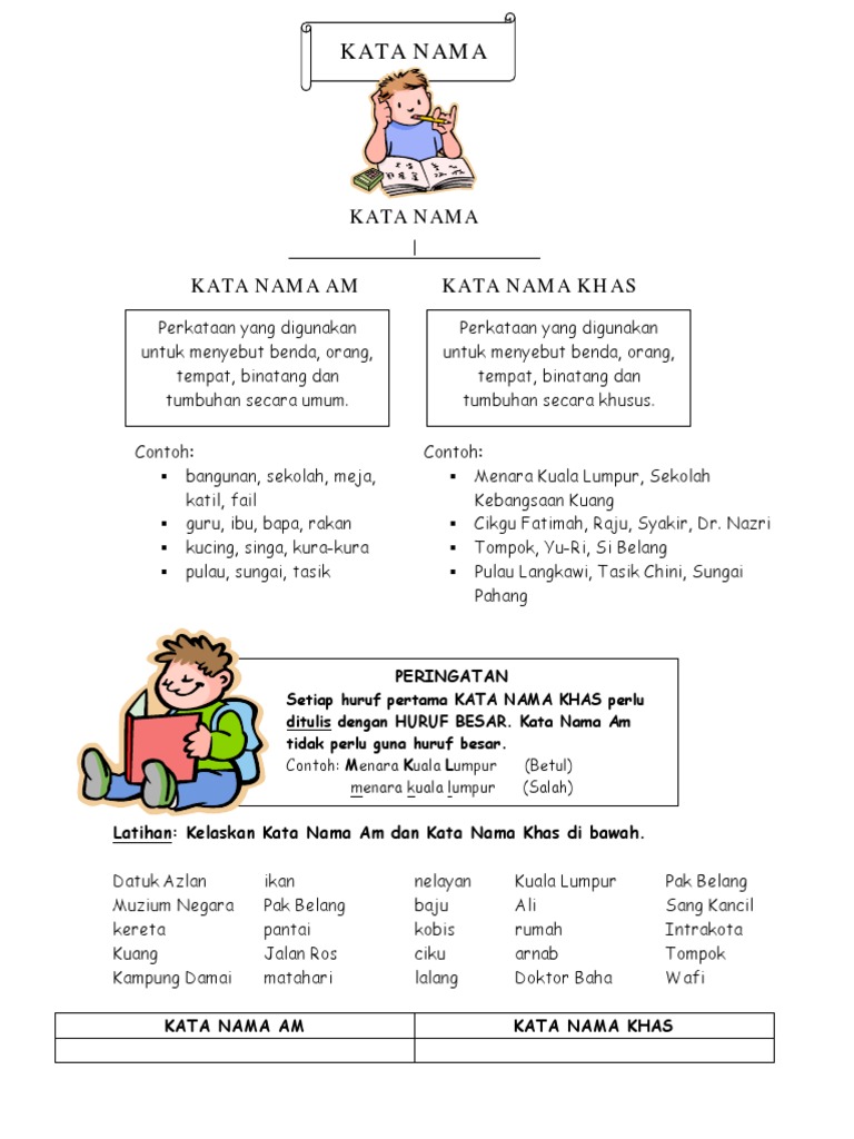 Kata Nama Digunakan Untuk Menyebut Nama Orang Banda Tempat Dan Binatang Kata Nama Terbahagi Kepada First Grade Worksheets Malay Language Body Preschool from i.pinimg.com Selalunya perkataan demikian menamakan orang, haiwan, tempat, benda, atau konsep. Kata nama ialah perkataan yang boleh menjadi unsur inti bagi binaan frasa nama. Aina binti ali, sang rangga. Terms in this set (10). Huruf awal perkataan tersebut ditulis dengan huruf kecil kecuali pada awal ayat. Email google classroom facebook whatsapp twitter reddit. Kata nama am khas youtube mp3 & mp4. Yang manakah kata nama am hidup bukan manusia?