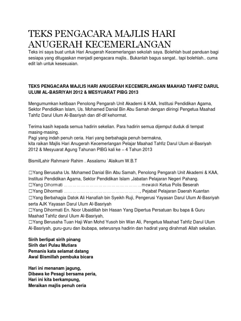Doc Teks Pengacara Majlis Anugerah Kecemerlangan Anisa Syahida Academia Edu from 0.academia-photos.com Hari yang berbahagia penuh bermakna ini kita raikan majlis kasih disemai bakti dituai sempena persaraan cikgu __nama guru dirai__. Doa sempena hari anugerah kecemerlangan. Terbang tinggi si burung helang berkicau kenari sambil berterbangan insan cemerlang negara terbilang anugerah diberi tanda kecemerlangan. Teks ucapan perasmian hari anugerah kecemerlangan. We are a sharing community. Please fill this form, we will try to respond as soon as possible. Teks pengacara majlis hari guru mp3 & mp4. So please help us by uploading 1 new document or like us to download