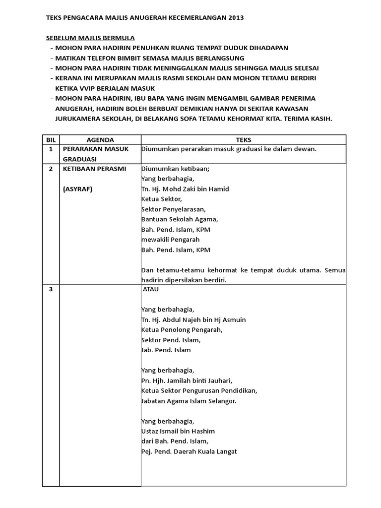 Sawah menghijau di tengah bendang, tumbuh dipinggir pohon bidara, pemanis kata selamat datang, awal bismillah tuan, saya ambil skrip pengacaraan yg tuan buat sebagai contoh kpd anak didik saya yg akan menjadi pengacara majlis persaraan cikgu di sekolah. Terima kasih diucapkan kepada semua yang telah memberikan kerjasama. Teks pengacara majlis hari guru mp3 & mp4. Tiada pengacara, tiada pembaca teks. Koleksi teks pengacara majlis hari guru these pictures of this page are about:teks pengacara majlis. Sila download menggunakan link yang telah disediakan. Kini, majlis anugerah pelajar cemerlang telah menjadi program tahunan setiap sekolah dalam negara ini. Bagi memastikan majlis berjalan dengan lancar, hadirin diingatkan agar mematikan atau memastikan telefon bimbit berada dalam pengaturcaraan senyap. Teks pengacara hari anugerah cemerlang akademik. Pihak majlis seterusnya berbesar hati untuk memberikan sedikit tanda kenang kenangan sebagai penghargaan dan tanda ucapan terima kasih kepada dr. Penganugerahan kepada pelajar cemarlang tingkatan 1 hingga tingkatan 6. Teks pengacara majlis hari anugerah kecemerlangan masa pembaca atur cara teks 8.25 hariff ketibaan tetamu assalamualaikum w.b.t dan teks ini saya buat untuk hari anugerah kecemerlangan sekolah saya. Contoh teks pengacara majlis majlis perkahwinan adha & azwan.