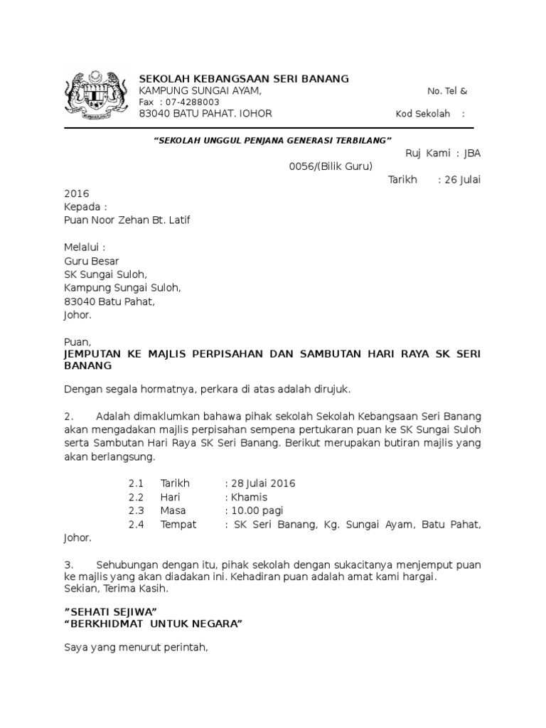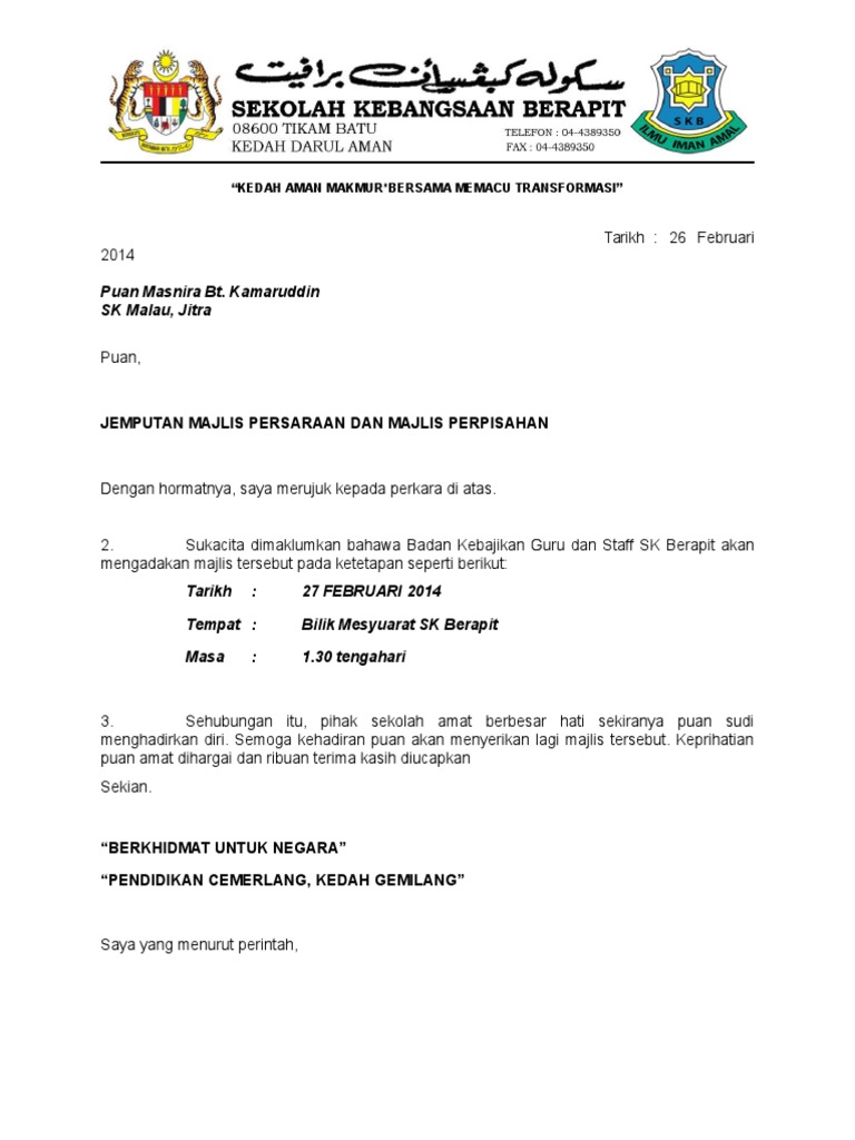Doa Majlis Makan Malam from contohsuratlengkap.org (2) kuala ampang, jalan awan, 68000 ampang, selangor darul ehsan tuan / puan, majlis perpisahan. Contoh surat dinas tentang gotong royong via www.neodv8.co. · pada 24 februari 2014 satu majlis perpisahan untuk ketua pegawai eksekutif lgmpc telah diadakan di. .jemputan majlis anugerah cemerlang, surat rasmi jemputan majlis makan malam, surat rasmi jemputan ceramah, surat rasmi tidak hadir ke sekolah, surat contoh surat jemputan penceramah via www.scribd.com. Adalah dimaklumkan bahawa pihak sekolah akan majlis perpisahan sempena pertukaran guru pada ketetapan berikut Surat jemputan penceramah via www.scribd.com. Contoh surat jemputan sebagai fasilitator via www.neodv8.co. Majlis pengetua sekolah malaysia cawangan melaka jemputan.